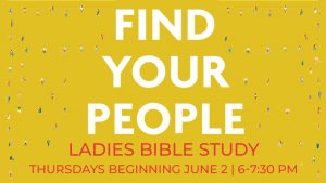 Join the Ladies Ministry for a weekly Bible Study entitled "Find Your People." It will take place every Thursday evening from 6-7:30 PM starting June 2.